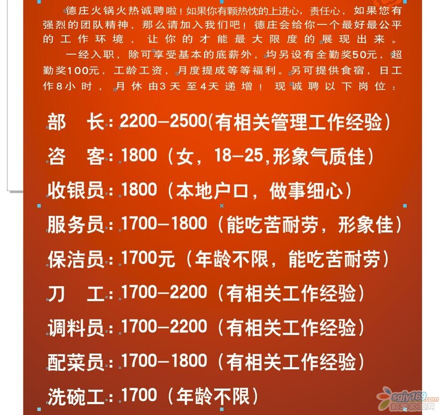 正文摘要:本帖最后由 天笑 于 2014-9-9 19:10 編輯 重莊德莊火鍋百年?yáng)|街韶關(guān)店位于湞江區(qū)百年?yáng)|街C區(qū)三樓1-3-08,為迎接冬季,亦是火鍋旺季。我公司現(xiàn)對(duì)外招聘各路人才,凡對(duì)餐飲行業(yè)充滿熱情 ... |