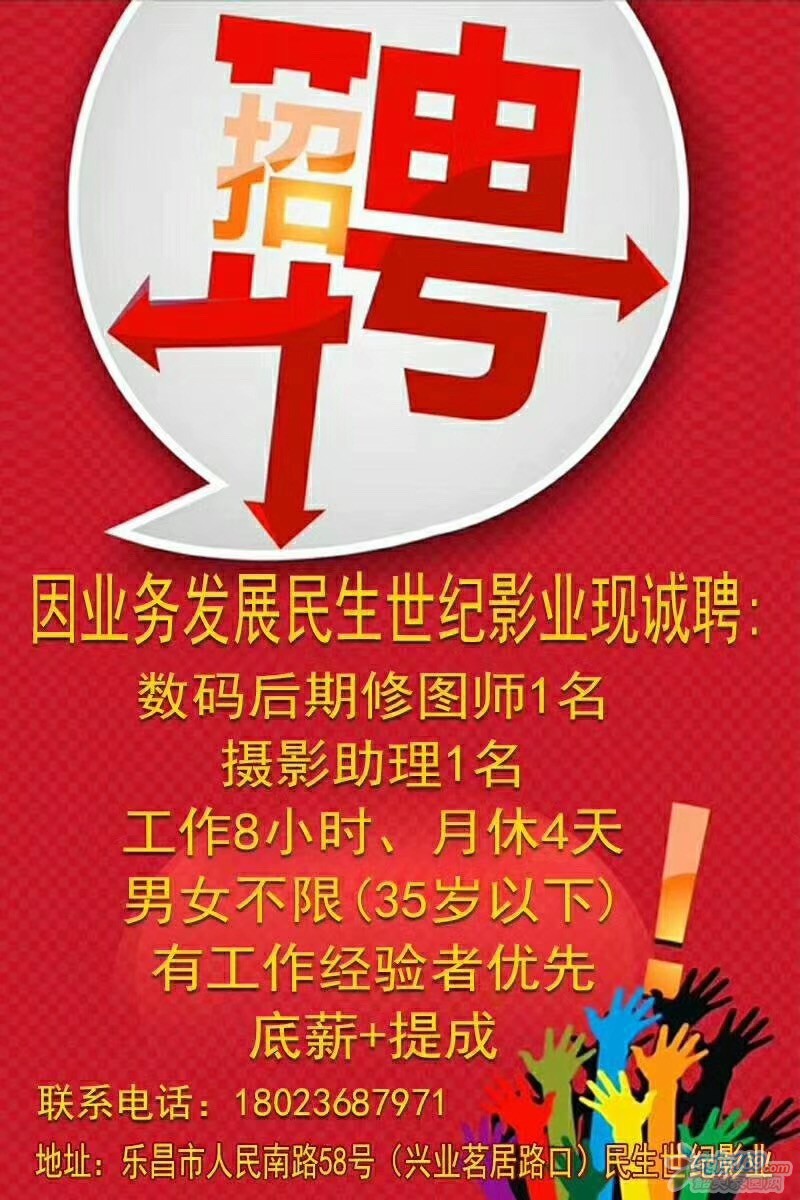 正文摘要:因業(yè)務發(fā)展民生世紀影業(yè)現(xiàn)誠聘: 數(shù)碼后期修圖師1名、攝影助理1名 工作8小時、月休4天 男女不限(35歲以下) 有工作經(jīng)驗者優(yōu)先 底薪+提成 地址:樂昌市人民南路58號(興業(yè)茗 ... |